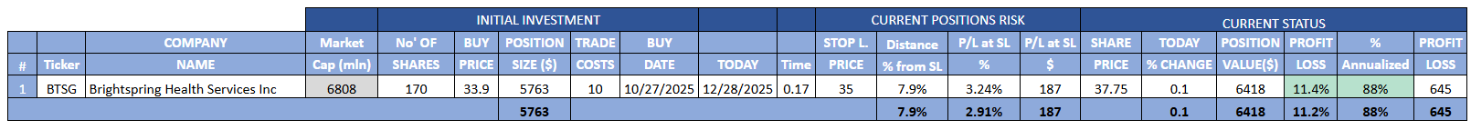 As mentioned in past weeks, I am closing down this portfolio. I’m left with a single position: BTSG.