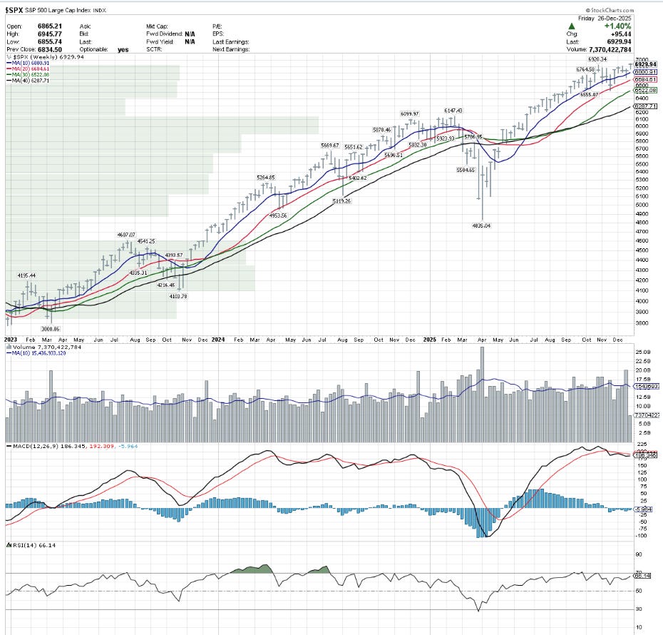 New highs / continuation: This week pushed back to fresh highs (high ~6946). It also held above the 10-week after last week’s dip.