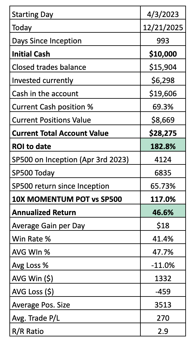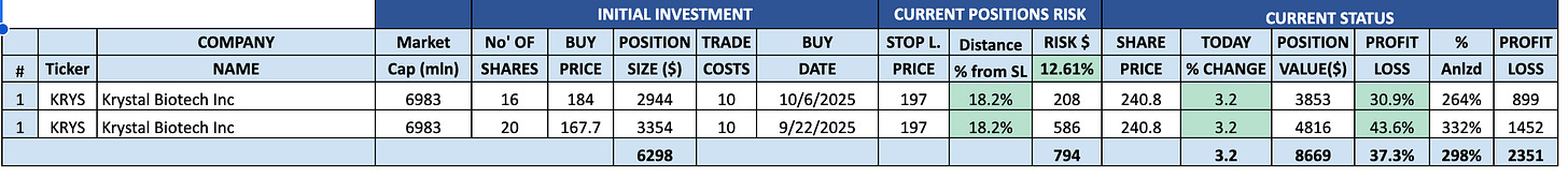 Last week was shaky in terms of volatility, and I was stopped out of three positions: ASND (-1.7%), NU (-10.5%), and FIX (+78%). Now I’m left with KRYS only, as shown below.