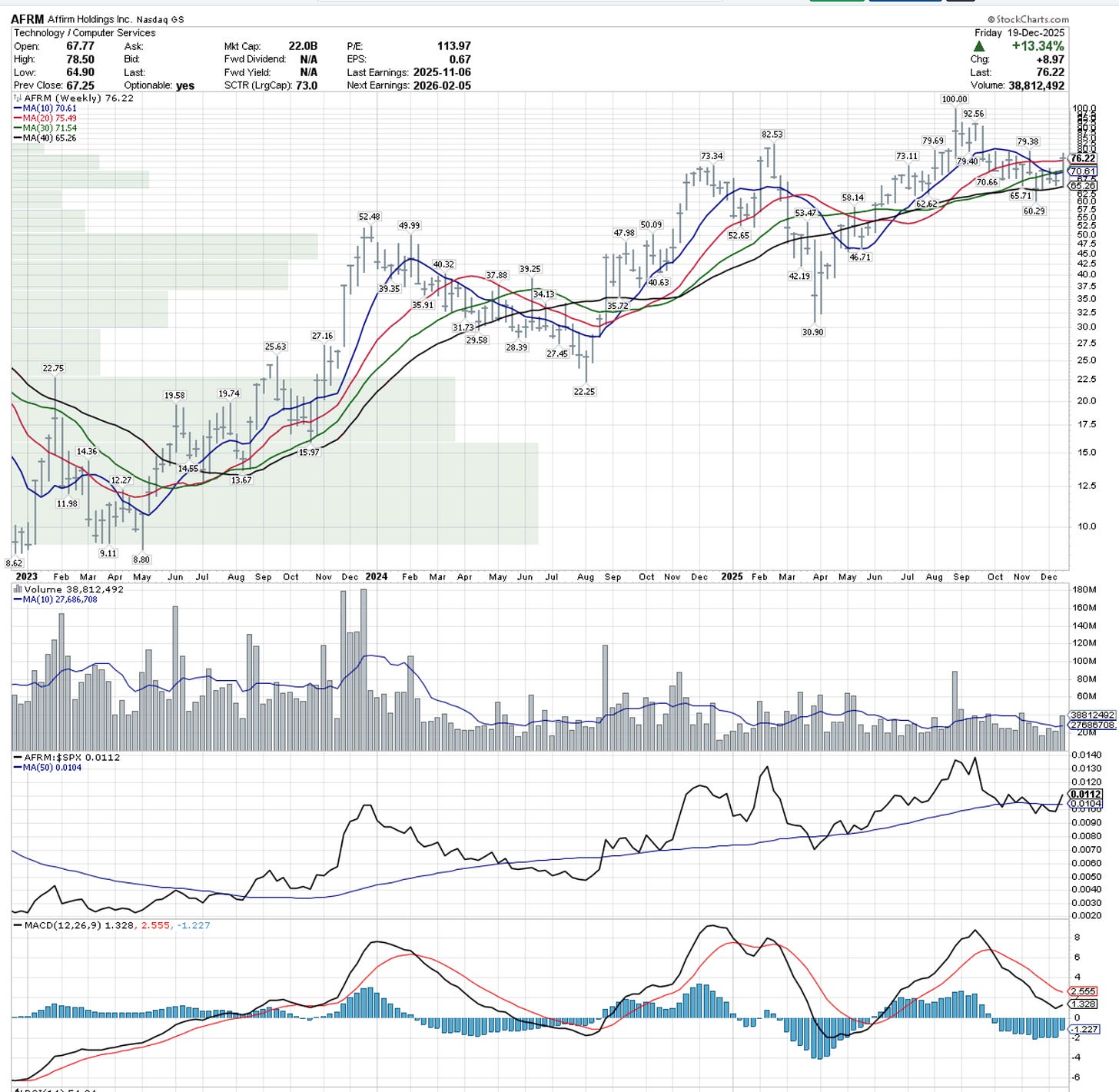 This week I’m issuing a BUY STOP order for 45 shares of AFRM at $76.50. If triggered, my initial stop-loss is $64.