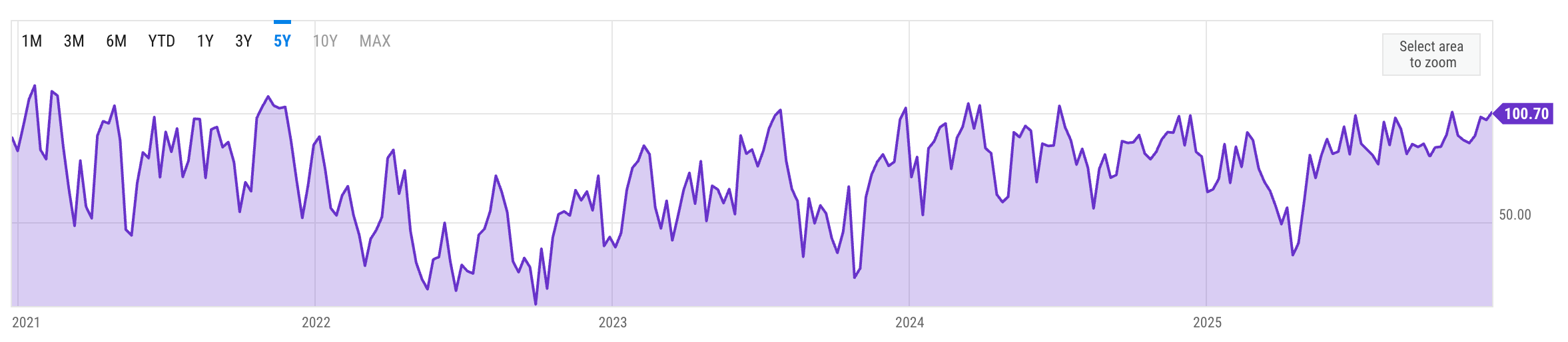 The NAAIM Exposure Index is around 100 right now, signaling potentially overbought conditions. Historically, it often cools off after readings near that level.