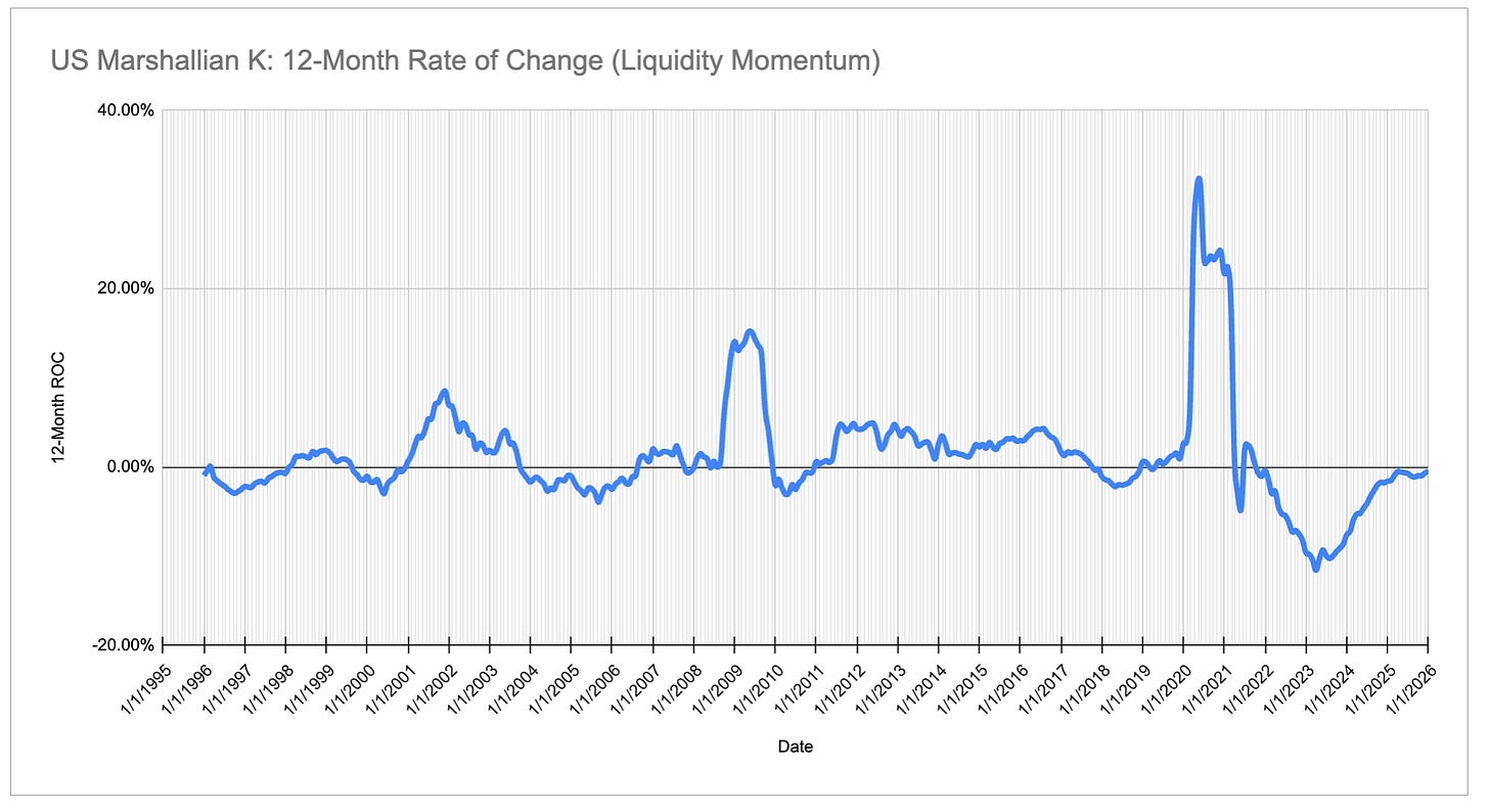 A highly effective way to read the money supply is to compare real M2 growth with real GDP growth. Using data from the FRED website, I track the rate of change (ROC) of this relationship (aka Marshallian K).