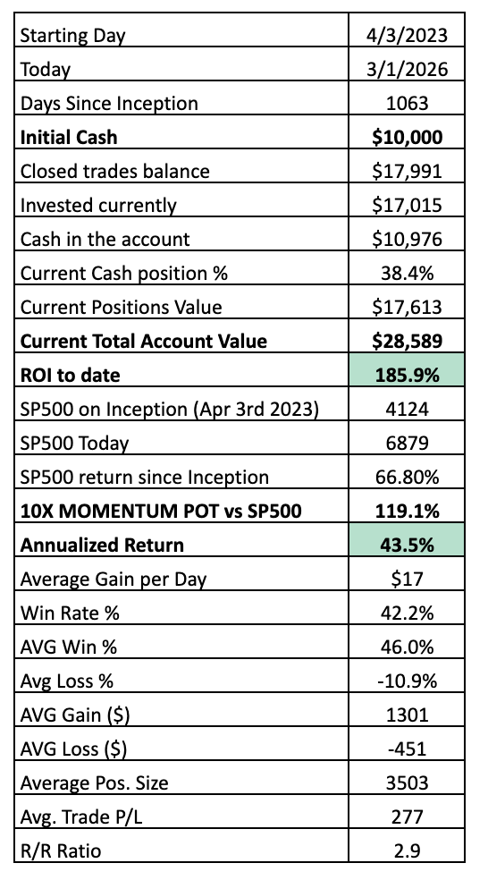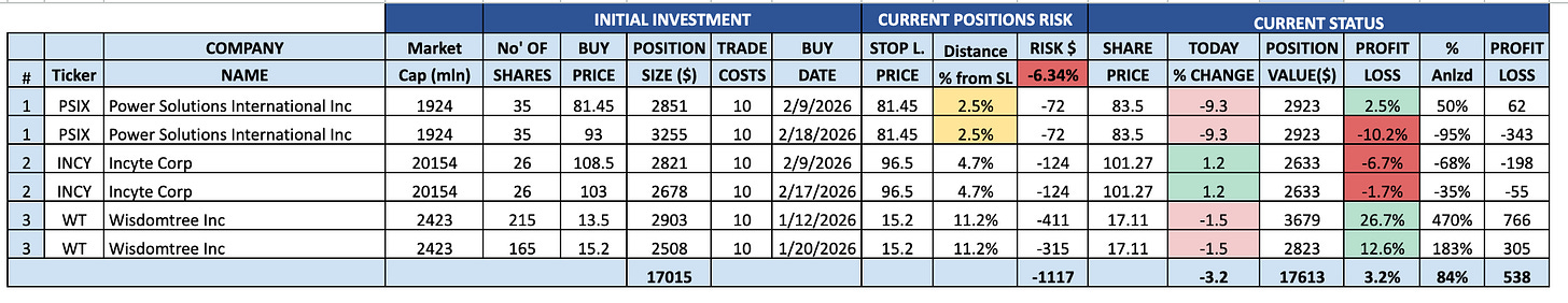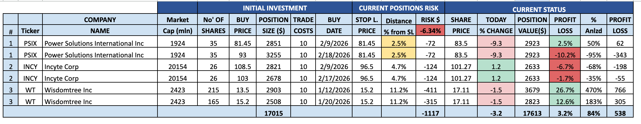 No stop losses were triggered last week, though my stop for PSIX is getting uncomfortably close. I’m not touching it and letting the system work. We will likely see elevated volatility early this week tied to the news out of the Middle East, so it’s very possible I’ll get kicked out of that trade.