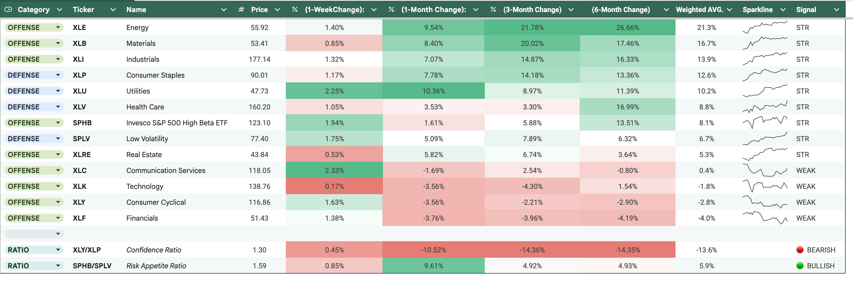 Energy (XLE): Strong across multiple timeframes (up ~26.7% over 6 months) and still screening as STRONG.
