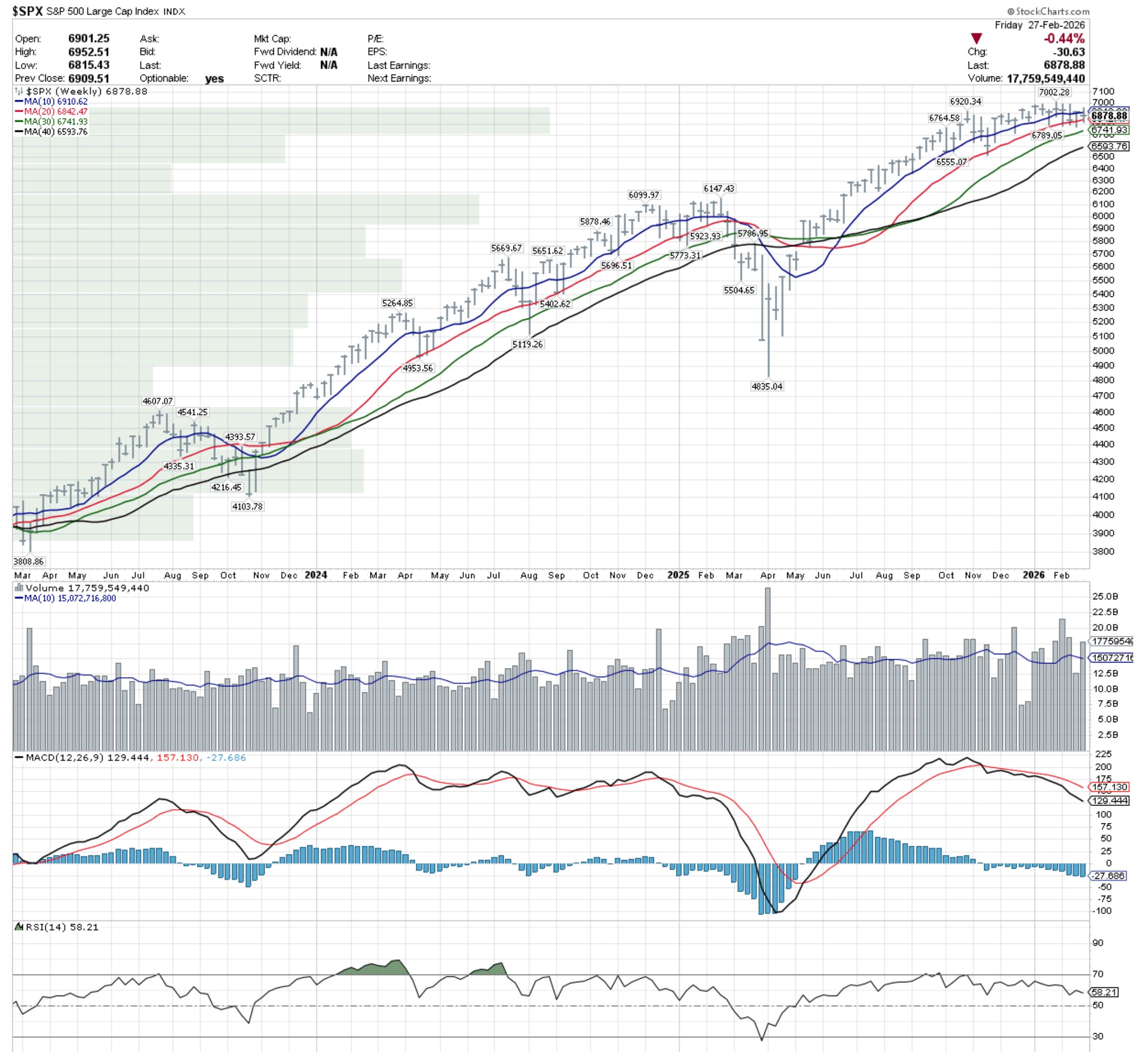 First support (near-term): The 20-week MA at ~6842 (we closed at ~6879, just barely holding above it).