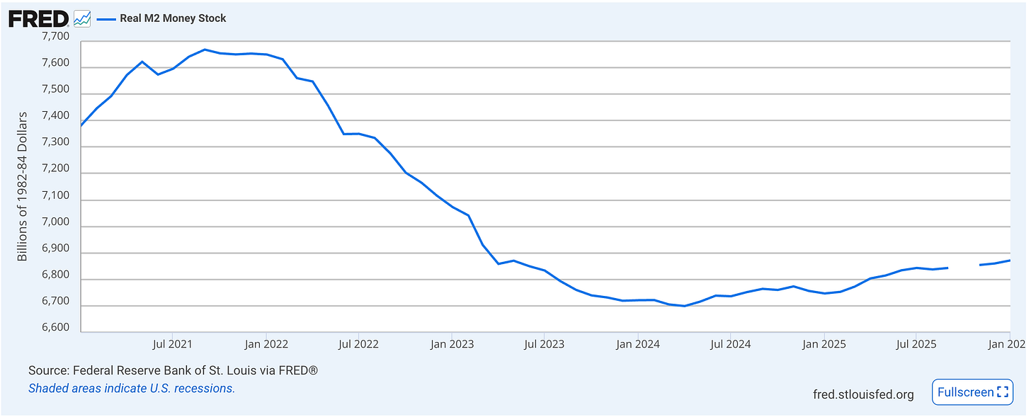 Pivoting to macroeconomics, we just got fresh data on M2 money supply growth for January 2026. The trend remains supportive, with total real monetary supply in the US continuing to grow at a moderate pace. (See the 5-year chart for real M2 below).