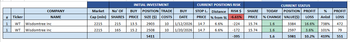 I am left with just one position: WT. It is currently up over 10% (cumulative of two batches). I have updated my Stop Loss for WT to $14.70.