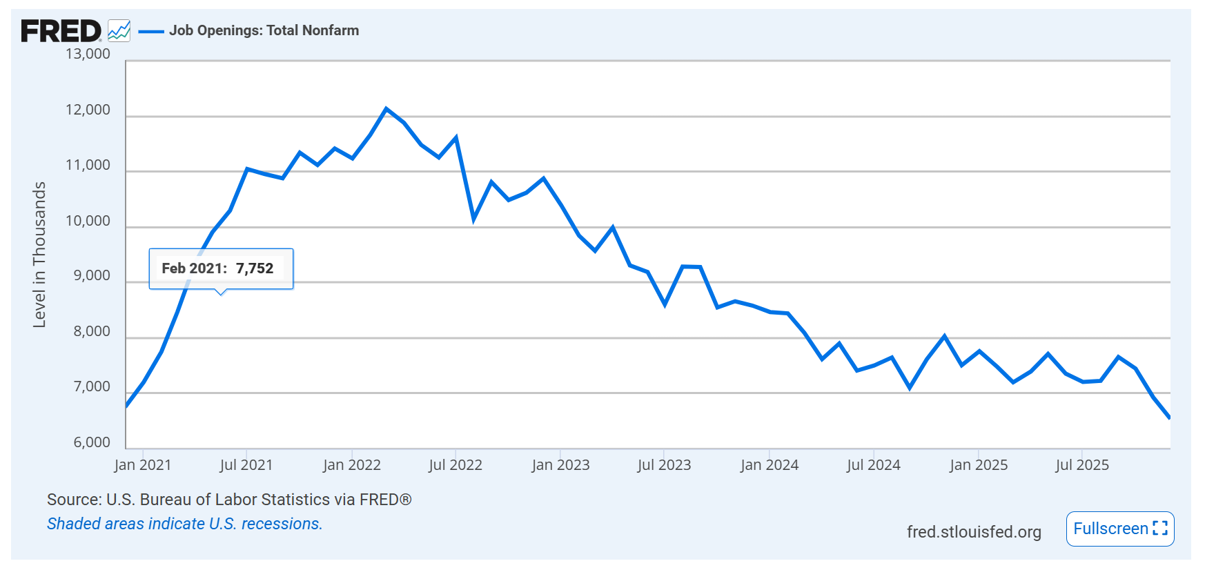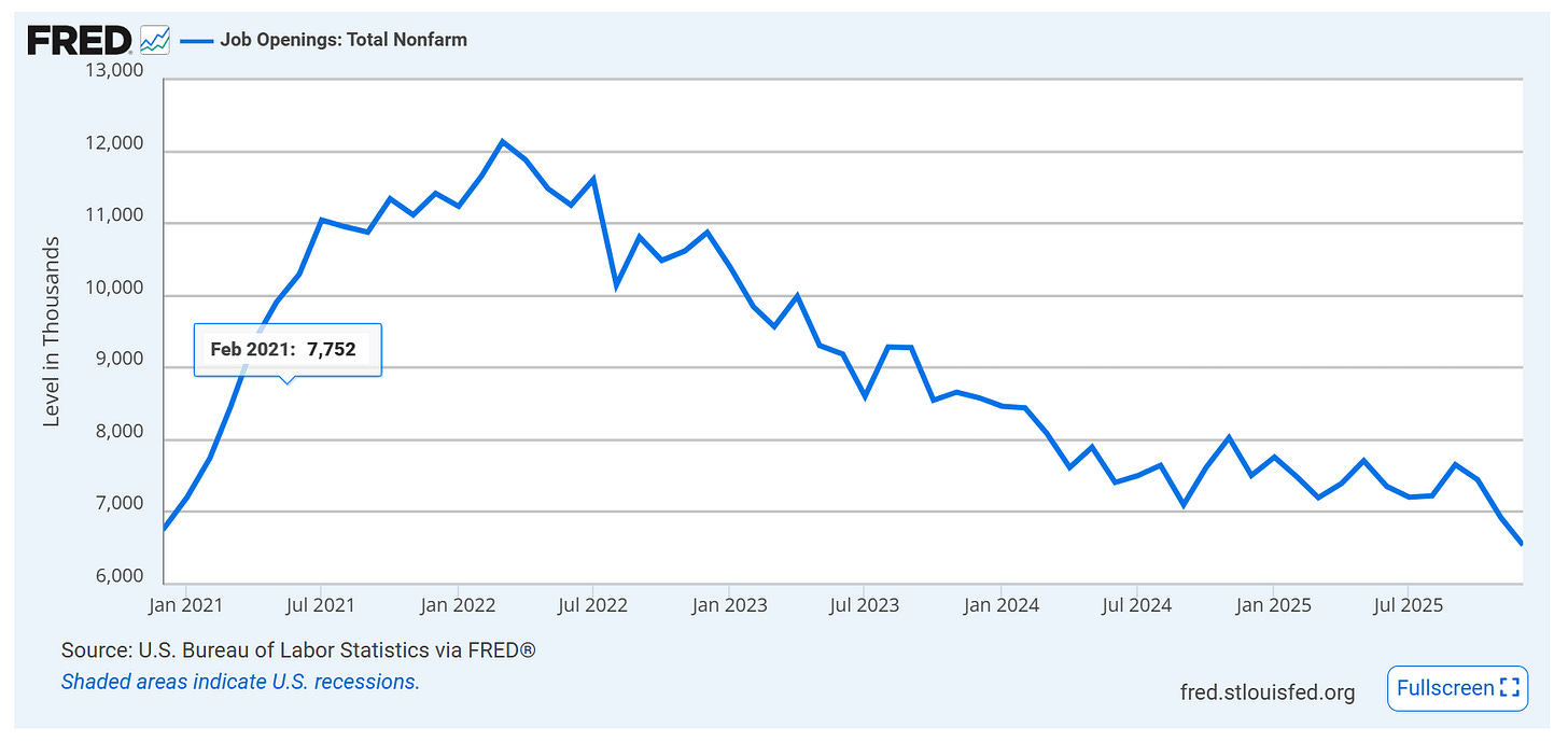 The last job openings report shows weak demand for new hires. As you can see in the chart below, it is at its lowest level in five years.