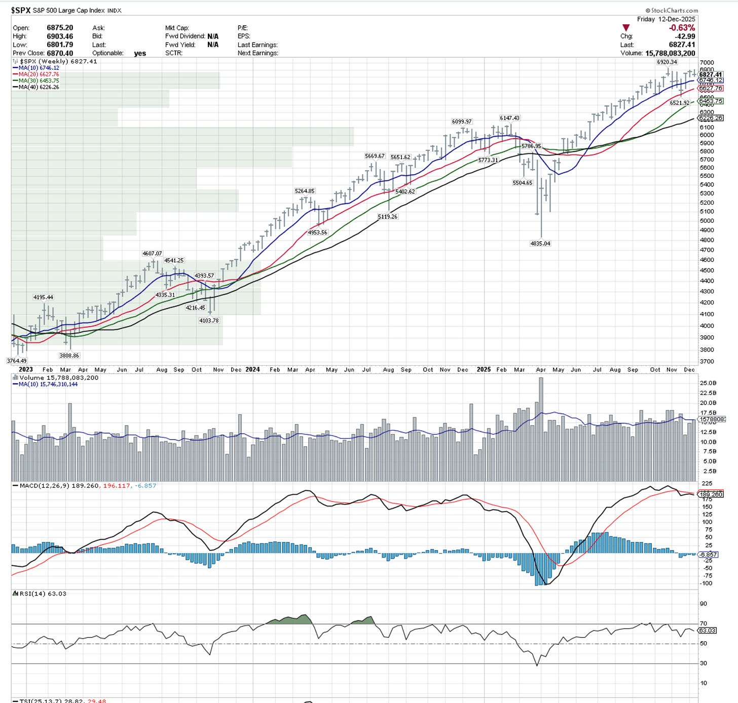Last line (stage risk): 40-week MA ~ 6,226. Sustained weakness below a flattening or rolling 40-week MA is how Stage 2 can turn into Stage 4.