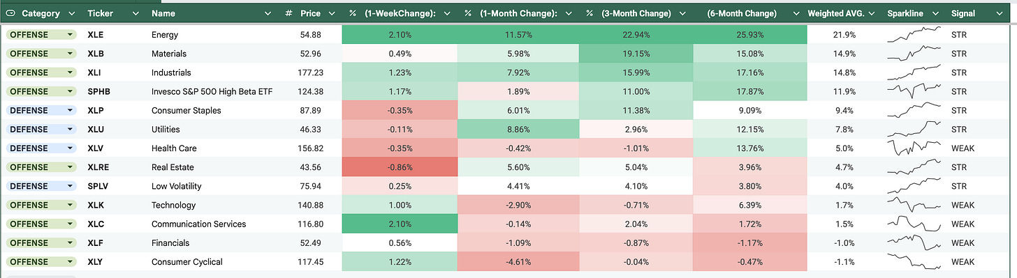 The Leaders: Energy (XLE) is the standout with the strongest trend. Materials (XLB) and Industrials (XLI) are showing “real-economy” leadership. Semiconductors (SMH) remain strong on a 6-month view and gained this week.