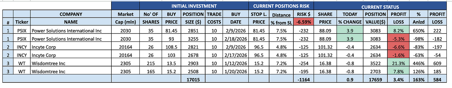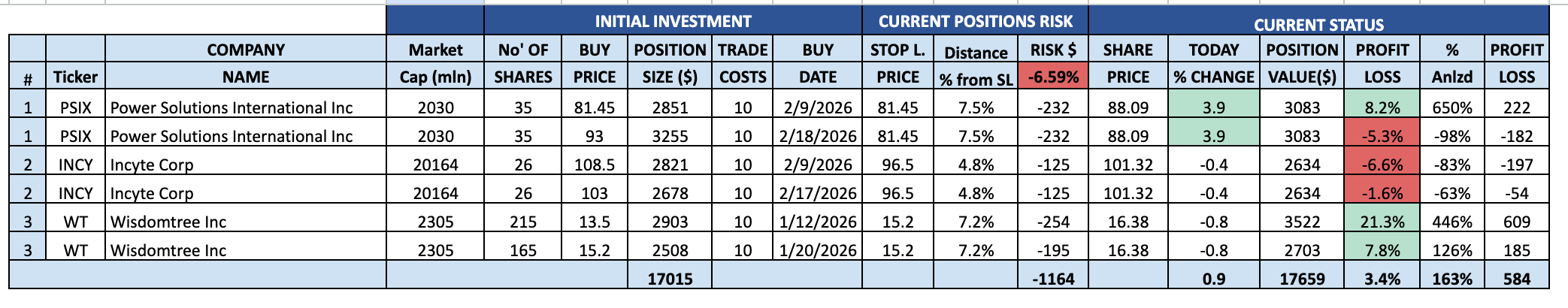 Last week, both of my orders were filled, so my positions in PSIX and INCY are now full. I also updated my Stop Loss on WT.